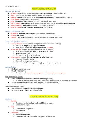 SUPER detailed PSYC Notes from all inclusive weeks: - Nervous System Overview - Neuroanatomy - Action Potentials & Synapses - The Basis of Neurochemistry ( types of neurotransmitters - amino acid, cholinergic, etc) - Psychopharmacology - Neuroendocrinology - Attention (I, II) - Memory (I, II) - Cognition and Reality - Animal learning (I, II, III, IV, V - includes habituation, associative learning, continguity, contingency, Pavlov's model, observational learning, etc) - Perception (sensing light, visual processing, hearing, other senses, perceptual interpretation) - Mental disorders (causes, treatments, Autism, Mood disorders) - Anxiety disorders - Schizophrenia INCLUDES: Easily-read, aesthetic notes which are colourcoded and structured clearly, key-words and points highlighted INCLUDES: Detailed experiments, case studies - guaranteed for you to not miss any small information in the exam