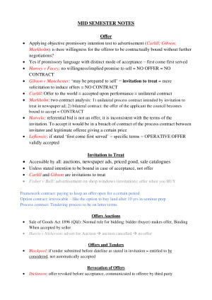 These are succint yet detailed notes including all cases and statutes learnt in the course, summarised into bullet points. Case names are all red, bold and italics. Different topics have different colors. It is easy to memorise for a closed-book exam. Notes are for all 13 weeks. It is a helpful summary of Rick's supplementary notes. Mid-semester exam topics include: Offer (Invitation to Treat, Offers Auctions, Offers and Tenders, Revocation of Offers, Termination by effluxion of time, Counter-offers) and Acceptance (different manners of acceptance, postal acceptance rule, acceptance by instantaneous Communication) Final exam topics include: Certainty and completeness, Intention to create legal relations, Consideration, Promissory Estoppel, Formalities, Express terms, Implied terms and statutory obligations, Interpretation of terms and exemption clauses, Statutory control of unfair terms: ACL 2010. Parts of some topics have been included in the Sample Notes, each topic shortened to take up 1 page.