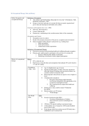 - Based on specific learning outcomes and assessable outcomes for final exam - Includes ALL 11 Weeks worth of content - Combines lecture content, tutorial content, and some readings - Format inspired by Cornell method of note taking - Grade Received: DISTINCTION INCLUDES: - Intro to OT - OT role and history - Self Care, Productivity and Leisure - Impact of Illness Disability - Therapeutic Relationships - Effective Communication - Client Interviews - Activity and Occupational Analysis - Adaptation and Grading - Client-centered practice - Goal Setting and Occupational Performance - OT Process Practice Frameworks - Learning Theories - Professional Reasoning - Evidence Based Practice - Ethical and Professional Behaviour - Participation and Family Related Constructs - Reflective Practice - Role of OT in Health Care - Practical Skills
