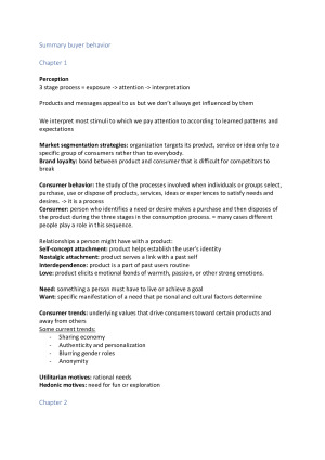 Simplistic and precise textbook notes for the Buyer Behaviour subject covering Chapter 1-10. Topics covered in textbook notes: Chapter 1: An Introduction to Consumer Behaviour Chapter 2: Consumer Well-Being Chapter 3: Perception Chapter 4: Learning & Memory Chapter 4: Motivation & Affect Chapter 6: The Self: Mind, Gender & Body Chapter 7: Personality, Lifestyles & Values Chapter 8: Attitudes & Persuasive Communications Chapter 9: Decision Making Chapter 10: Buying, Using & Disposing Solomon, Michael R. (2020). Consumer Behaviour: Buying, Having, and Being, Global Edition, 13th ed, Pearson.