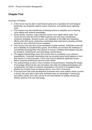 Highly descriptive textbook chapter summary notes for Product Innovation Management / New Product Management - specific to final exam topics. Topics/chapters covered in textbook notes: Chapter 5: Timing of Entry Chapter 7: Choosing Innovation Projects Chapter 8: Collaboration Strategies Chapter 10: Organising for Innovation Chapter 11: Managing the New Product Development Process Chapter 12: Managing New Product Development Teams Chapter 13: Crafting a Deployment Strategy Schilling, Melissa 2019. Strategic management of technological innovation, Sixth Edition. McGraw-Hill Education.