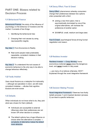 FINS3655 Behavioural Finance These notes are VERY comprehensive and structured, and use information from the lecture slides, additional readings and group presentations. They cover all topics from Week 1 to Week 10. These include: PART 1: Decision Making 1. Intro into behavioural finance 2. Bias (default, decoy) 4. Decisions Under Uncertainty (EU, EV, Prospect Theory, St Petersburg Paradox) 5. Framing Effects (Asian Disease, Frequency, Choice vs Pricing) 6. Reference Point Adjustments (house money effect) 7. Consequentialist View (sure thing principle, disjunction effect, illusion of control) 8. Neurofinance (PFC, emotional brain, somatic markers) 9. Reward VS Fear System (dopamine, serotonin, testosterone) PART 2: Perception & Learning 1. Paradox of Information (overload and interference) 2. Bayesian VS Reinforcement Learning 3. Neglect of Weight of Evidence (base rate, discriminability) 4. Law of Small Numbers (gambler's fallacy, non random, insufficient samples) 5. Information Acquisition (in-attentional & risk blindness) 6. Neuronal Adaptations (risk after effect bias, normalisation theory, pessimism bias) PART 3: Applying Insights 1. LENON Toolbox 2. Household Finance (automatic enrolments, SMarT, prize linked savings) 3. Investor Behaviour (neuropharmacology, disposition bias, theory of mind) 4. Corporate Finance (zimbardo & milgram experiment)