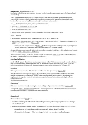 Completed in Sem 2 2019, got a 88 for the mid-sem despite not finishing it on time. The notes cover the following topics: Most Favoured Nation Quantitative Measures Internal Measures - Art III National Treatment [including Art III:2 and Art III:4 GATT] Subsidies and Dumping Safeguards against Dumping Arts XXI and XXIV (Security Exception and RTAs) Brief Policy notes.