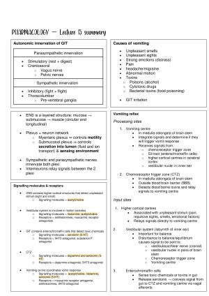 These notes consist of summaries (including neatly organised tables) of all examinable lecture content. All relevant drugs and concepts are covered. These notes will help with quick revision when studying for assessments. I mainly used these notes when studying for the final exam. Topics include: Drug discovery, How drugs interact with receptors, Autonomic Nervous System, Pharmacokinetics, Pharmacogenomics, Drugs in Sport, Eicosanoids, Immunopharmacology, Drugs that affect the gastrointestinal system, Asthma, Drugs to treat obesity, Drugs to treat diabetes, Drugs in the cardiovascular system, Introduction to the central nervous system, Drugs to treat neurodegeneration, Drugs to treat pain, Antidepressants, Drugs of dependence, Indigenous medicine, Venoms & Toxins, Mechanisms of toxicity, Harnessing toxicity