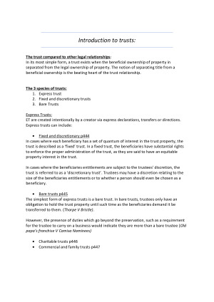 Good notes with additional documentation of relevant pages in the text book. Goes through: Express Trusts Fixed and discretionary trusts Bare trusts Resulting trusts Is formatted in a step-by-step way to work through during the exam.