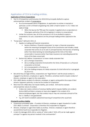 Detailed notes of the entire course NOT an exam summary. Includes: Introduction to Competition Law Application of CCA Fundamental Competition Law Economic Concepts Cartel Conduct Misuse of Market Power Exclusive Dealing Vertical Price Fixing Mergers and Acquisitions Authorisation and Notification