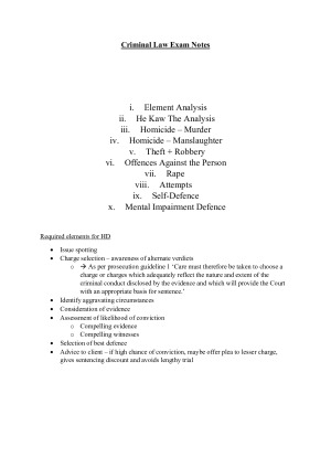 Covers all of the examined topics, these notes contain skeleton answer structures with prompts for required elements as well as case details where necessary. Topics covered: i. Element Analysis ii. He Kaw The Analysis iii. Homicide – Murder iv. Homicide – Manslaughter v. Theft + Robbery vi. Offences Against the Person vii. Rape viii. Attempts ix. Self-Defence x. Mental Impairment Defence