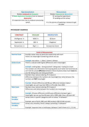 Comprehensive notes for all content relevant to the assignment and final exam for Research Methods for Human Inquiry PSYC30013. I used this document to collate, organise and revise my knowledge of the subject in my own words. It contains detailed instructions on R code application +what each statistical test is and how/when to use it. Using only this document I scored 98% on the assignment and an 88 overall in the subject. Includes: Basics of R (L2, L3 & L4) - Operators, Functions, Variables, Vectors, Packages and Measurement Advanced R (L5, L6, L7, L8) - Tables, Pipes, Grouping, Filter & Arranging, Selecting & Mutating, Pivoting Wider & Longer, Grammar of Graphics and Geoms Statistical Theory (L9 & L10) - Probability, Distributions, Sampling Distributions, Central Limit Theorem, Null Hypothesis Testing and Statistical Decision Making Chi-Squared Test (L11 & L12) - Goodness of Fit and Test of Independence T-Tests (L13 & L14) - One Sample T-test, Independent Samples T-test, Paired Samples T-test and Assumptions ANOVA (L15 & L16) - One-way ANOVA and Two-way ANOVA Regression (L17 & L18) - Correlation and Linear Regression Psychological Assessment (L18, L19, L20) - Principles & Applications of Reliability, Validity Criteria in Psychological Assessment and Practical Impacts of Validity