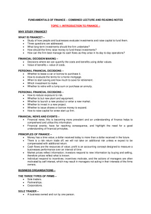 Includes weekly notes on: - Topic 1: Introduction to Finance - Topic 2: Time Value of Money - Topic 3: Financial Mathematics - Topic 4: Valuation of Securities - Topic 5: Cost of Capital - Topic 6: Capital Budgeting - Topic 7: Project Evaluation - Topic 8: Risk and Return - Topic 9: Portfolio Theory - Topic 10: Market Efficiency - Topic 11: Options
