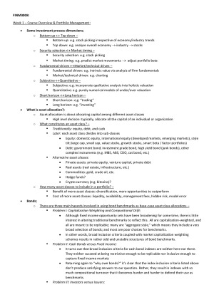 Notes include weeks 1-12 lectures and include notes from the assigned readings. Tutorial material is included where appropriate. Topics: Week 1 – Course Overview & Portfolio Management: Week 2 – Objectives & Dimensions of Risk: Week 3 – Asset Allocation: Overview & Mean-Variance Model: Week 4 – Asset Assumptions: Week 5 – Asset Allocation – More Methods Alpha & Beta: Week 6 – Equities: Week 7 – Fixed Income: Week 8 – Alternative Assets: Overview, Property & Infrastructure: Week 9 – Alternatives: Hedge Funds, Private Equity, Commodities: Week 10 – Global Investing and Currency Hedging: Week 11 – Portfolio Structure Within Asset Classes: Week 12 – Industry Ethics, Fund Governance, and Rebalancing: