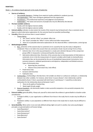 Notes include weeks 1-12 lectures and include notes from the assigned readings. Tutorial material is included where appropriate. Topics: Week 1 – An evidence-based approach to the study of leadership: Week 2 – The evidence about traits and leadership: Week 3 – The evidence on Emotional Intelligence and Leadership: Week 4 – The Evidence on Transformational Leadership: Week 5 – The evidence on leading organisational change: Week 6 – The Evidence on Decision Making: Week 7 – Developing and Communicating a Vision: Week 8 – Power and Influencing: Week 9 - N/A Week 10 – Map and analyse your social network: Week 11 – Overcoming opposition and setbacks: Week 12 – Prejudice and Stereotypes: