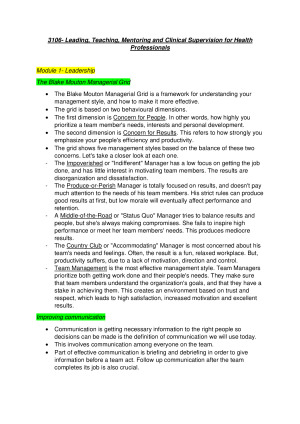 Detailed and comprehensive notes that covers all lectures and tutorials and will help you study for assignments. Topics include- leadership, teaching skills and mentoring and clinical supervision