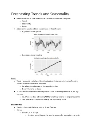 Notes based on the material from all lectures, tutorials and weekly readings. Topics include: - Introduction to Forecasting - Time Series - Basics of Forecasting - Forecasting Trends and Seasonality - Forecasting Autoregressive (AR) Process - Forecast Comparison Tests - Forecast Combination - Direct vs. Iterated Multi-step Forecasting - Forecasting with Nonlinear Models - VAR Modelling and Forecasting These notes helped me do extremely well (97 in course overall) and so would highly recommend them!!