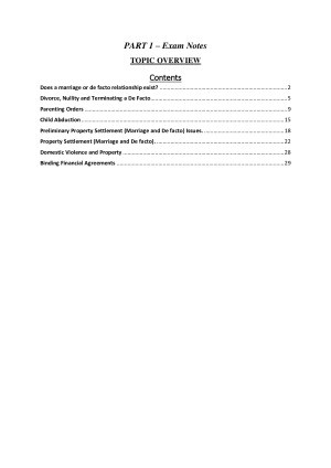 I finished this subject in Sem 1 2020 with a 84 D Grade. These notes were specifically designed in a step-by step checklist format for the purpose of answering exam style questions. You will save so much time preparing for your exam by purchasing these notes as they cover all the content covered during the course and can be used directly in the final exam. These notes are invaluable for revision. You will not be disappointed with your purchase. The notes cover every topic of the course, including: Divorce, Nullity and Terminating a De Facto Parenting Orders Child Abduction Preliminary Property Settlement (Marriage and De facto) Issues Property Settlement (Marriage and De facto) Domestic Violence and Property Binding Financial Agreements
