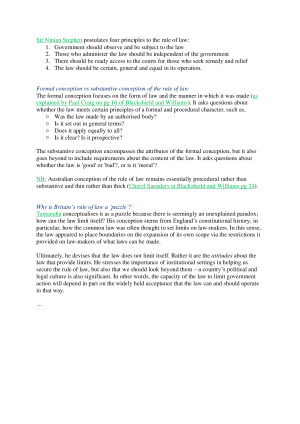 Comprehensive notes for LAWS1141. Contains everything you need to know to thoroughly engage with the ENTIRE course. I used these notes to write 'one of the best responses' the marker read for my Mid-Term. Contains the following topics: - Constitutionalism - The Rule of Law - Separation of Powers - Westminster System - US System - Australia's constitutional hybrid - Australia's Path to Federation - Australian Federalism - Popular sovereignty - Statutory Interpretation - Principle of Legality - Presumption against Retrospectivity - Indigenous People and the Constitution - Sovereignty and self-determination - Treaty making - Aboriginal people and the Electoral Franchise - the 1967 Referendum and the Races Power - Reform for constitutional recognition - Powers and Functions of the Legislature - Parliamentary privilege - Eligibility to be elected into Parliament - Judicial review of the legislature - Voting at Federal Elections - Express and Implied Right to vote - History and Composition of the Executive - Powers of the Executive - Mechanisms by which the Executive is held to account - Responsible Government - History and overview of the Judiciary - Composition of the Judiciary - Judicial Appointments - Judicial Accountability - Separation of Judicial Power - What is Judicial Power - Boilmaker's Principle - Persona Designata - Incompatibility Rule - Powers of the State Legislature - Human Rights - Bills and Charters of Rights - Constitutional Amendment on the federal level - Constitutional Amendment on the state level - Australia's last referendum - Manner and form requirement Happy studying!