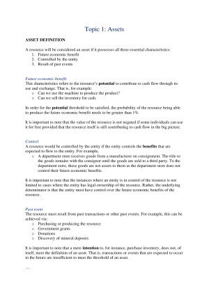 An entire comprehensive set of notes for ACCT1511. For each topic, all the journal entries needed to complete your Quiz x2, Tutorial Participation, and Final are listed. For topics such as financial analysis and direct method cash flow statements, concise TEMPLATES have been provided. All you need to do is fill in the values from the Balance Sheet and Income Statement for your Quizzes and Final. A step by step process for topics like bonds calculations, cost vs revaluation models calculations, and overhead calculations have been provided. Achieved: 92 for Quiz 1, 100 for Quiz 2, 100 for Tutorial Participation, 95 for Final using these notes. Contains the following topics: - Asset definition - Asset recognition - capitalising vs expensing - current vs non-current assets - betterment vs repairs and maintenance - cost model - impairment - disposal of assets - revaluation model - development vs research - goodwill - intangible assets - amortisation and impairment of intangibles - liability definition - liability recognition - current vs non-current liabilities - borrowings - notes payable - bonds: normal, discount, premium - provisions vs contingent liabilities - warranty - components of shareholder's equity - private placement - general public issue: payable in full on application - general public issue: payable by instalment - cash trust, allotment and call - bonus issues - share splits - share buybacks - dividends declared and paid - revenue definition - revenue recognition - point of sale vs delivery - during production vs on completion of production method - expenses definition - expenses recognition - classification of expenses - common size statements - financial ratio analysis - profitability ratios (ROA, ROE, profit margin, gross margin, and so forth) - activity turnover ratios (asset turnover, inventory turnover, and so forth) - liquidity ratios (current ratio, quick ratio, and so forth) - financial structure ratios (debt-to-equity ratio, debt-to-assets ratios) - accounting policy choices - how to prepare cash flow statements - operating activities - investing activities - financing activities - indirect method - how to analyse the cash flow statement - cost classification - COGM - COGS - Raw materials, direct labour, overhead, variance, and so forth - Budgeting - sales budget, production budget, direct materials budget and so forth - behavioural aspects (lack of goal congruence, slack creation, myopia, resolutions). Happy studying!