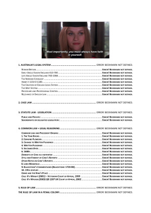 HD FULL COURSE NOTES + EXAM TIPS! (With Contents page) Covering ALL content from the term 1. Australia's Legal System 2. Case Law 3. Statute Law 4. Common Law + Legal Reasoning 5. Rule of Law 6. Negligence 7. Intentional Torts 8. Defences 9. Judges and Judging 10. Modern Lawyers 11. Aboriginal Dispossession and the Law 12. Mabo and Legal Change 13. Introducing Equity 14. Statutory Interpretation 15. Reading Statutes 16. The Rule of Law Today