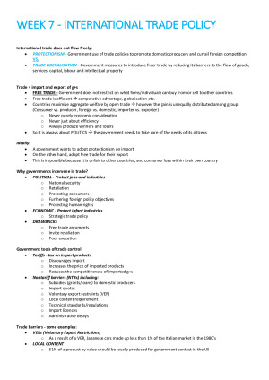 MGMT1101 - FULL HD COURSE NOTES (92) Covers ALL lecture content CLEARLY and CONCISELY with EXAMPLES from the course. CONTENTS: 1. Global Business Environment 2. State Vs. Firm? The Political/Legal Environment 3. The Socio-Cultural Environment 4. The Economic Environment 5. The Great Digital Divide 7. International Trade Policy 8. Corporate Responsibility For International Business 9. The New Wild West
