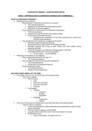 Includes weekly notes on: - Topic 1: Introduction to Corporate Finance - Topic 2: Capital Investment Decision - Topic 3: Risk Analysis, Real Options and Capital Budgeting - Topic 4 - 7: Capital Structure - Topic 8: Valuation and Capital Budgeting for Levered Firm - Topic 9: Dividend Policy - Topic 10: Leasing - Topic 11: Mergers, Acquisitions and Divestitures