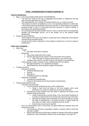 Includes weekly notes on: - Topic 1: Introduction to Trusts - Topic 2: The Three Certainties of Trust - Topic 3: Creating an Express Trust - Topic 4: Resulting Trusts - Topic 5: Charitable Trusts - Topic 6: Trustees' Duties and Powers - Topic 7A: Trustees' Liabilities to Beneficiaries - Topic 7B: Tracing - Topic 8 & 9: Fiduciary Obligations - Topic 10: Accessory Liability - Topic 11: Confidential Information - Topic 12: Equity Overview