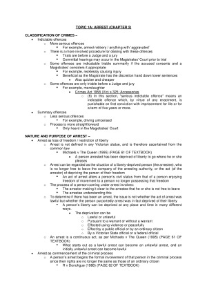Includes weekly notes on: - Topic 1A: Arrest - Topic 1B: Bail - Topic 2: Search and Seizure - Topic 3A: Questioning - Topic 3B: Evidence Identifying an Accused - Topic 4: Admissibility of Evidence - Topic 5A: Introduction to Evidence - Topic 5B: Relevance and Discretion of Evidence - Topic 6A: Witnesses - Topic 6B: Privileges - Topic 7: The Course of Evidence - Topic 8: Credibility Evidence - Topic 9: Opinion Evidence - Topic 10A: Hearsay - Topic 10B: Documents - Topic 11: Tendency and Coincidence - Topic 12A: Post Offence - Topic 12B: Joint and Seperate Trials