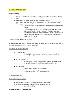 Comprehensive notes that cover all critical theories and concepts in the subject. Each section explains theories through examples and case studies, incorporating readings. Section 10 contains a subject overview that summarises the entire subject and its key concepts. The layout is easy to read and navigate, with each section and subsection clearly labelled. CONTENTS 1. Introduction to Key Concepts – Punishment and Imprisonment 2. Women in Prison 3. Indigenous Imprisonment 4. Mental Illness and Imprisonment 5. The Prison Environment 6. Foucault on Punishment 7. Garland on Punishment 8. Actuarialism: the New Penology 9. Cohen on Punishment 10. Subject Overview and Summary