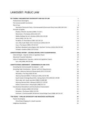These notes include all readings prescribed for the unit and incorporates information provided by lecturers in seminars. It is a COMPLETE and comprehensive set of notes for the semester and you will basically need nothing else. All case law for the course is presented in tables with the facts, key parts of the judgement and a summarised principle of each case. I spent hundreds of hours summarising them this way and it will save you a LOT of time. All case law is colour coded in pink, and all legislation is blue. This makes locating it within the notes nice and easy. Includes all topics (and subsections within them): 1. Parliamentary Sovereignty and Rule of Law 2. Constitutional History 3. Constitutional Amendment 4. 'The People' 5. Representative Parliament 6. Responsible Executive 7. Executive Powers 8. Oversight of Executive 9. Constitutional Safeguards for Judicial Power