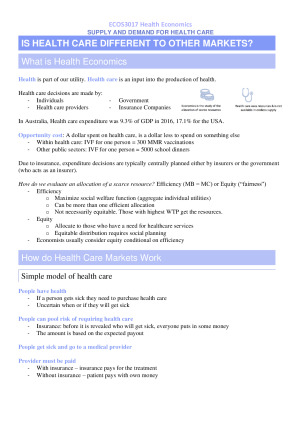 Comprehensive set of notes for ECOS2002 - completed in Semester 2, 2020. Very detailed in describing economic concepts with diagrams. Covers Topics: - IS HEALTH CARE DIFFERENT TO OTHER MARKETS? - PRODUCTION OF HEALTH - SUPPLY & DEMAND FOR HEALTH INSURANCE - DOES HEALTH INSURANCE WORK? - SUPPLY OF HEALTH CARE - THEORY OF GOVERNMENT INTERVENTION - HEALTH CARE SYSTEMS - PUBLIC VS PRIVATE INSURANCE - ALLOCATING RESOURCES TO HEALTH CARE: WHAT IS THE VALUE OF HEALTH - TECHNOLOGY AND RISING COSTS OF HEALTH CARE Also includes integrated summaries of course readings !