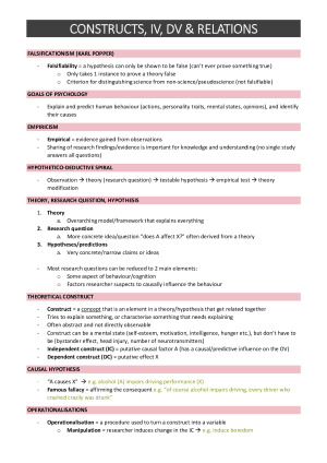 Detailed notes from all lectures, including examples (in green) and colour-coded key words/points. Topics covered: - Constructs, IV, DV, & relations - Relationships, moderators, & mediators - Basic design, variables, & internal validity - Interactions - Confounds, counter-confounds, & sensitivity - Design-related confounds: classification, detection, & remedies - Procedural confounds - Measurement artifacts & control techniques - Statistical correlations - External validity -
