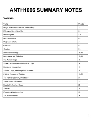 These notes provide a summary of all of the content for ANTH1006. They are super useful for the weekly quizzes/exams, as well as the research essay. Each lecture topic is covered, as well as a summary of the readings (some of which are 40+ pages). The topics covered are: Drugs, Pharmaceuticals and Anthropology (2) Ethnographies of Drug Use (3) Hallucinogens (4-5) Drug Symbolism (6) Drug Law Reform (7) Cannabis (8) Cocaine (9) Neuropharmacology (10-12) Drug Abuse and Addiction (13-14) The War on Drugs (15) A Law Enforcement Perspective on Drugs (16) Drugs and Incarceration (17) Alcohol, Drugs, and Indigenous Australia (18) Political Economy of Opiates (19-20) The Political Economy of Tobacco (21) Tobacco and Shamanism (22) Erectile Dysfunction Drugs (23) Steroids (24) Emergency Contraception (25) The Placebo Effect (26)