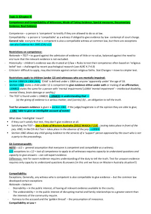 Very detailed notes summarising the text and unit notes into one guide perfect for the Topics: Topic 1: Intro  Topic 2: Relevance  Topic 3: [Chapter 4] Competence and Compellability of Witnesses, Mode of Taking Evidence, Special measures, Documentary Evidence, Real Evidence  TOPIC 4: HEARSAY [Ch9 & 10]  TOPIC 5: Admission and Confessions: [—329, Chapter 12]  Topic 7: Admissibility of Evidence: Opinion, Scientific and Expert Evidence: [—371]  TOPIC 8: CREDIBILITY AND CHARACTER [Chapter 8]  TOPIC 9: BROADLY: PROBITY, PREJUDICE AND SIMILAR FACT EVIDENCE [Chapter 7]  TOPIC 10: IDENTIFICATION EVIDENCE [PG 371-382, 416-421]  TOPIC 11: Warnings, Vulnerable witnesses  TOPIC 12: Privileges and Immunities