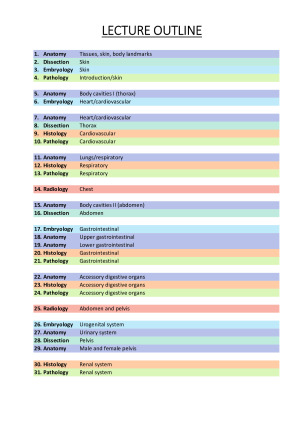 Full course notes with colour-coded sections for anatomy, pathology, histology, embryology, and radiology. Notes include fusion of lecture content with extra research for better understanding - all formatted in bullet points and simplified tables, and with key anatomical terms in bold along with some mnemonics and hand-drawn/annotated. Topics covered: - ANATOMY = tissues/skin/bony landmarks, thorax, cardiovascular, respiratory, abdomen, gastrointestinal, accessory digestive organs, urinary, pelvis - PATHOLOGY = introduction/skin, cardiovascular, respiratory, gastrointestinal, accessory digestive organs, renal - HISTOLOGY = cardiovascular, gastrointestinal, accessory digestive organs, renal - EMBRYOLOGY = introduction, cardiovascular, gastrointestinal, urogenital - RADIOLOGY = chest, abdomen/pelvis - DISSECTION = skin, thorax, abdomen, pelvis