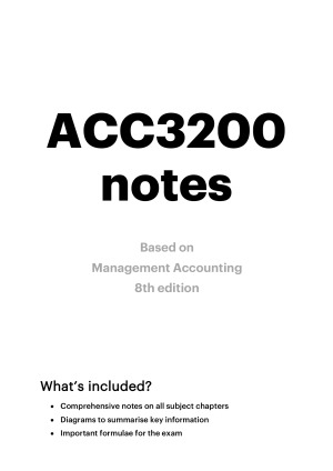 These notes were carefully crafted and used throughout the semester and the final exam to score 91% on the unit. Included in this document you will find: • Comprehensive notes on all chapters used in the subject (Management Accounting 8th edition, Langfield-Smith, et. al) • Diagrams to summarise key information • Important formulae for the exam Please enjoy these notes and good luck for the unit. I hope you find it as enjoyable as I did!