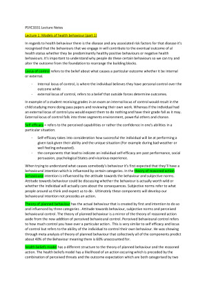 Contains all 18 Lectures Lecture 1: Models of health behaviour (LV) Lecture 2: Models of health behaviour (LV) Lecture 3: Obesity-causes and consequences (LV) Lecture 4: Obesity–causes and consequences (LV) Lecture 5: Nutrition, eating, and exercise (LV) Lecture 6: Nutrition, eating, and exercise (LV) Lecture 7: Risky behaviours (LV) Lecture 8: Chronic pain (KF) Lecture 9: Sleep and its disorders (KF) Lecture 10: Medically unexplained symptoms (KF) Lecture 11: Chronic illness (KF) Lecture 12: Placebo and nocebo effects (KF) Lecture 13: Healthcare utilisation (KF) Lecture 14: Healthcare utilisation (KF) Lecture 15: Stress and illness (BL) Lecture 16: Coping with stress (BL) Lecture 17: Public health (LV) Lecture 18: Public health (LV)