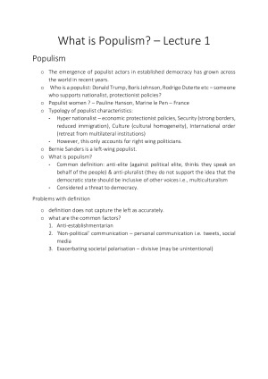 Class and Reading notes in concise and easy to read format. Includes all lecture notes an 8/12 weeks of textbook notes Topics Covered: What is populism? Rise of populist actors Modes of populist appeal Styles and the media Populism and domestic policy Populism and foreign policy Populism in Australia Responses to populism Populism post-COVID-19 Topic Review