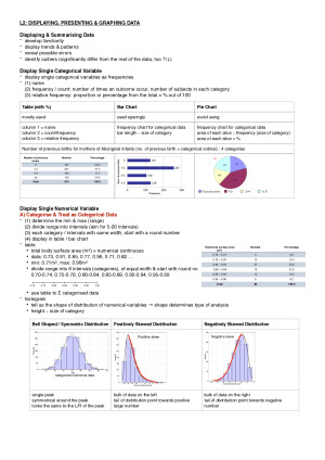 These notes (Part 1) comprise Lectures 1-6 while the remaining notes are available in Part 2 due to size constraint on this site. Notes are clearly organised and written in point forms. Each lecture note is 2-3 pages long yet contains all essential info from lecture slides + explanation stressed by lecturers + relevant diagrams. This set of notes is a great resource for the assignment and a life-saver during the final exam - which I managed to get 97% :) TOPIC LIST L1: Introduction, datasets, types of variables L2: Displaying, presenting & graphing data L3: Measures of central tendency, spread, sampling variation, standard error L4: Normal distribution L5: Confidence interval for a mean & comparison of 2 means L6: Using confidence intervals & p-values to interpret results of statistical analyses