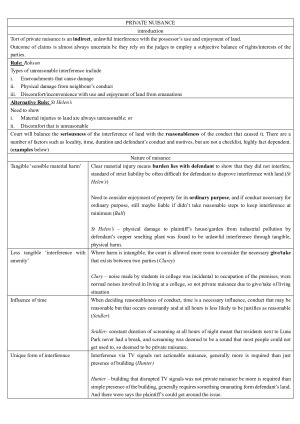 Includes Eric's class notes and self-summarised notes from readings. Topics included as following: 1. Battery and Assault 2. Trespass to land 3. Private nuisance 4. Negligence - duty of care (reasonable foreseeability), kind of defendant (occupier, public authorities), defendant's conduct (pure omission), type of harm (mental harm, purely economic loss), breach of duty, negligence calculus, standard of care (reasonable person), causation (scope of liability), various defences ( contributory negligence, complete defence to negligence), statutory cause of action (wrongful death), vicarious liability, apportionment, damages assessment. Checklist and template style notes suitable for the final exam.