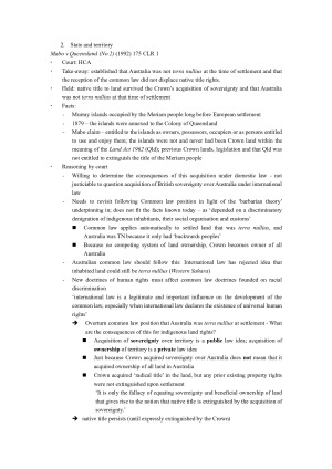 Includes Jared's Class notes and self-summarised notes from all readings. Arranged in order according to Topics. 1. The conception of public law and the state 2. The state and territorial acquisition 3. The state and people 4. The state and extraterritoriality 5. The acquisition of independent statehood in Australia 6. Australian public law 7. Organisation of public power within states 8. Sources of public international law 9. The organisation of public power among states 10. The law of treaties and treaty making in Australia 11. the rule of law 12. structure of legislature 13. delegated legislation 14. structure of executive 15. executive power 16. structure and independence of judiciary 17. judicial power, jurisdiction and justiciability 18. public law litigation 19. international human rights 20. protection of rights in Australia 21. relationship between international law and domestic public law Includes important case notes for essay and checklists for hypo.