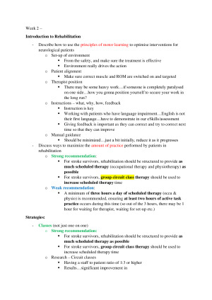 - Topics from all weeks and lectures are covered: Week 1: Activity: assessment of acute conditions with the potential to recover – stroke, TBI, GBS, Evidence-based practice: use of clinical practice guidelines, systematic reviews, clinical trials in stroke, TBI, GBS Week 2: Introduction to Rehabilitation, Activity: sitting, standing – biomechanics of abnormal movement and clinical implications of research findings Week 3: Activity: standing up – Biomechanics of abnormal and clinical implications of research findings, Activity: walking – biomechanics of abnormal and clinical implications of research findings Week 4: Mechanisms and Medical Management of Guillain Barre Syndrome, Activity: reaching and manipulation – biomechanics of abnormal and clinical implications of research findings Week 5: Stroke: definitions, subtypes and management, tested in further trial Impairment: loss of coordination – biomechanics of the impairment and clinical implications of research findings Week 6: Mechanisms and management of traumatic brain injury Week 8: Impairment: Weakness as a result of loss of muscle activation – nature of impairment and clinical implications of research findings, Impairment – Increasing strength using electromyography feedback and electrical stimulation: background principles and applications for intervention Week 9: Impairment: spasticity – biomechanics of the impairment and implications of research findings, Impairment – spasticity – assessment, management and evidence of efficacy of interventions to reduce spasticity Week 10: Impairment: secondary impairments – nature of impairments and clinical implications of research findings, Secondary Impairments: Cardiorespiratory deconditioning Week 11: Loss of sensation (kinaesthetic, tactile) – nature of the impairment, clinical implications of research findings and intervention strategies, Loss of sensation (vestibular, visual) – nature of the impairment, clinical implications of research findings and intervention strategies Week 12: Impairment: Non-motor impairments – nature of the impairment, clinical implications of research findings and considerations for training, Impairment: Non-motor impairments – nature of the impairment, clinical implications of research findings and considerations for training Week 13: Clinical Reasoning: Analyse a person after acute brain damage performing an everyday activity - Lecture, tutorial and reading contents are summarized in the notes in addition with self-researches - Case study and evidence study are also included with relevant descriptions, interpretations and implications - There are personal insights at the end of each of the topic to emphasize the important components of that lecture where you can focus more on - The notes are combined with words, colours and figures which are in great detail and comprehensive to help you achieve an HD