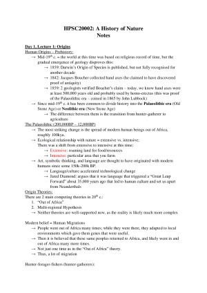HPSC20002: A History of Nature (summer intensive) Extensive notes covering weeks 1-9 Topics Covered: - Human Origins - Domestication - Ancient Civilizations & Nature - Early Agriculture & Farming - The Invention & Conception of Nature - Cities & Urbanization - Voyages of Discovery, Exploration & Trade - Engineered & Designed Landscapes - Measuring the World; Quantification - Evolution & Darwinism - Evolutionary Psychology & Sociobiology - Environmentalism; National Parks - The Frontier Myth - Human Nature - Major Extinctions; the Anthropocene