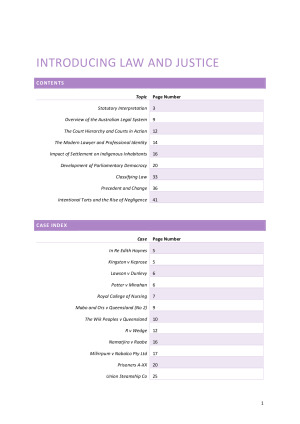 What’s covered? These notes cover the full course of readings in summarised form ready for exams. These readings are from the CURRENT textbook. Full case briefs of all cases covered in the course are also included, along with an index of page numbers to navigate through the notes! 53 pages total. Topics: - Statutory Interpretation - Overview of the Australian Legal System - The Court Hierarchy and Courts in Action - The Modern Lawyer and Professional Identity - Impact of Settlement on Indigenous Inhabitants - Development of Parliamentary Democracy - Classifying Law - Precedent and Change - Intentional Torts and the Rise of Negligence