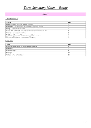 What’s covered? These notes provide a summary of all articles covered in LAWS1061, including the key ideas, and a critique/analysis of these ideas. The notes also include brief essay plans based on the key topics in the course. Topics covered: - Balancing act between defendant and plaintiff - Causation - Breach of duty - Damages - Critique of the tort system