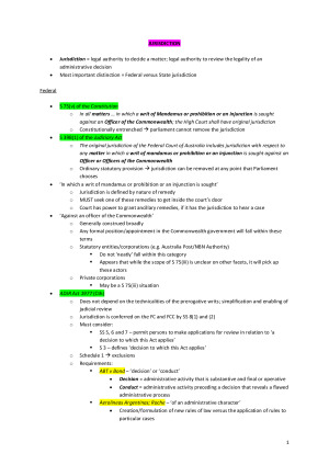 - Full course content in summarised form in preparation for exams, covering all topics/cases/legislation in the course - Structured according to how the problem question must be addressed Topics: 1) Jurisdiction 2) Standing 3) Reasons 4) Grounds of Review 5) Jurisdictional Error 6) Remedies