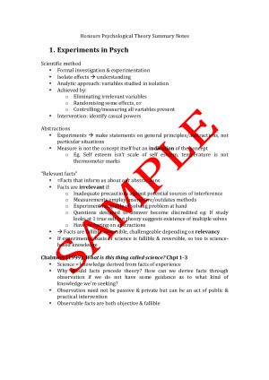 A clear, comprehensive summary of notes for Theory in Psychology (Honours Semester 1). The notes include key information from all lectures and all course readings, breaking down important concepts in easy-to-read dot points. Topics include: -Experiments in psychology -Naive empiricism -Theory ladenness of observation -Embracing psychological theory -Form of theory -Surrogates for theories -Near Tautologies -Self-categorisation theory and self-determination theory -Theory, operationalisation, and replication -Falsification -Research programs -Science as problem-solving -Assumptions of ethics -Psychology as history, psychology as politics.