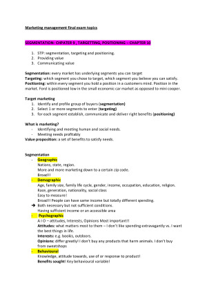 Simplistic and precise textbook chapter notes for the final exam in the Marketing Management subject - basic and covering all topics. Topics covered in textbook notes: - Understanding Marketing Management (Chapter 1 & 2) - Capturing Marketing Insights (Chapter 3 & 4) - Connecting with Customers (Chapter 5, 6, & 7) - Building Strong Brands (Chapter 9) Kotler, P. & Keller, (2016). Marketing Management, 15 edn, Pearson, Edinburgh Gate.
