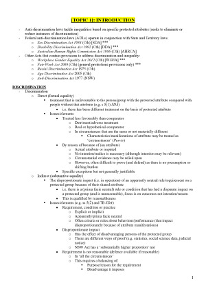 This is a comprehensive yet concise set of scaffolds and notes which will allow you to excel in LAWS3411. It covers in detail the entire course and all the weeks, including: - sex discrimination - disability discrimination - sexual and disability harassment - Fair Work Act (general protections) - anti-discrimination law process I completed the unit with a D mark of 76 and used only this set of notes.