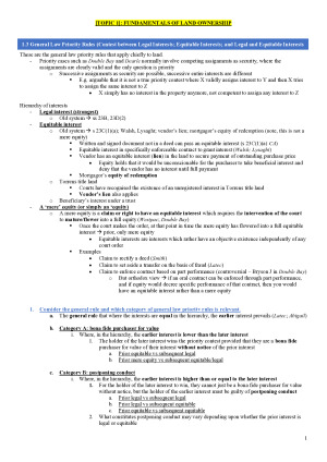 This is a comprehensive yet concise set of reading notes which will allow you to excel in the unit. It covers in detail the entire course (for both mid-semester and final exams) and all the weeks, including: - fundamentals of land ownership - Torrents title - co-ownership - easements - profits a pendre - covenants over freehold land - leases and licences - mortgages