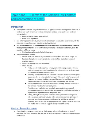 These notes cover every topic covered and assessed throughout the entirety of the unit including: Topic 1 → Who is an employee? Identifying employment relationships Topic 2 and 3 → Terms of the Common Law Contract and Incorporation of Terms Topics 4 and 5 → Introduction to Australia’s Industrial Relations System and the Safety Net Topic 6 → Enterprise Agreements and Collective Bargaining Topic 7 → Termination of Employment Topic 8: The General Protections → Part 3-1 of the Fair Work Act Topic 9 and 10 → Workplace Health and Safety and Bullying Topic 11: Discrimination and Sexual Harassment These notes were made using the prescribed textbook, the lectures and the tutorial questions provided throughout the entire trimester. The notes contain both the appropriate legislation used in this unit and the appropriate cases (which are in red for easy reading and spotting in exams). This was the only thing i needed to bring into my exam which enabled me to get distinction.