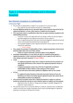 These notes cover every topic covered and assessed throughout the entirety of the unit including: Topic 1: General Land/Priority Rules Topic 2: Electronic Conveyancing Topic 3: The Torrens System and Indefeasibility Topic 4: Statutory Exceptions to Indefeasibility → Fraud Topic 5 → Paramount Interests and In Personam Exception Topic 6: Inconsistent Legislation Topic 8: Unregistered Interests Topic 9: Co-Ownership: Joint Tenancy and Tenancy in Common and Rights and Duties Topic 10: Co-ownership: Severance of Joint Tenancy These notes were made using the prescribed textbook, the lectures and the tutorial questions provided throughout the entire trimester. The notes contain both the appropriate legislation used in this unit and the appropriate cases (which are in red for easy reading and spotting in exams). This was the only thing i needed to bring into my exam which enabled me to get distinction.