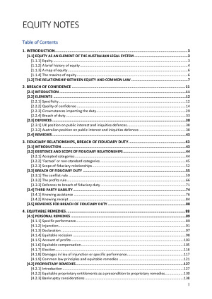 All topics covered: introduction; breach of confidence; fiduciary relationships and breach of fiduciary duty; equitable remedies; assignment of property rights in equity. Notes are organised using decimal headings system with table of contents. Very easy to navigate. Not just lecture notes — I read the cases.